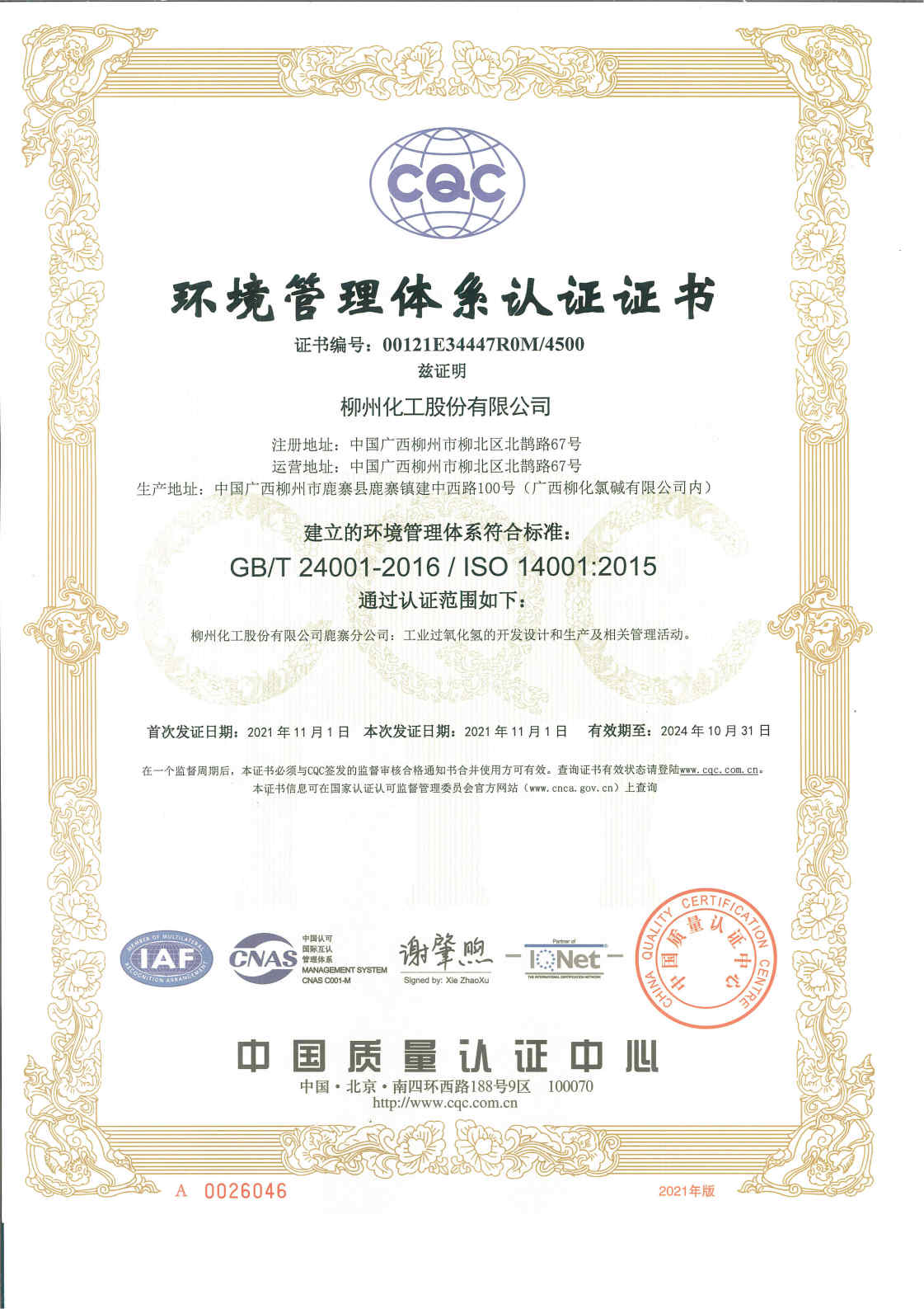 2021年11月獲ISO14001環(huán)境管理體系認(rèn)證證書